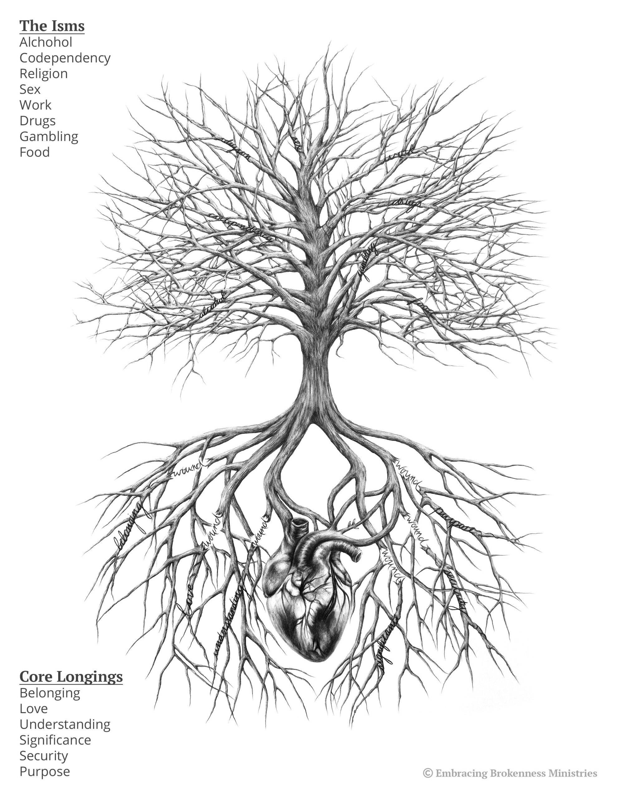 In the root system of the tree depicted in this drawing, you’ll see breaks. Those breaks represent the wounds or trauma that occur in our lives. Some as a result of the actions of others and some as a result of our own choices. The roots themselves represent our core longings. Those longings were met entirely by God when we walked and talked with Him daily in the Garden - prior to the “Fall”. As you can see, the roots are connected to our heart and God’s heart for us, which is represented as such. When sin entered our world the root system was damaged, and we became disconnect from our own hearts and distanced from God. The result of sin interfered with our ability to have those core longings met in Him. The longing for significance, for purpose, to give and receive love as originally intended, to understand and be understood, for safety and security and perhaps the one that plagues us most, belonging.