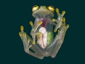 The glass frog is native to the Central American Rainforests. The general background coloration of most glass frogs is primarily lime green. Still, the abdominal skin of some members of this family is transparent and translucent, giving the glass frog its common name. When active, their blood makes them visible; when sleeping, most of the blood is concealed in the liver, hiding them. Glass frogs are arboreal, living mainly in trees, feeding on small insects, and only coming out for mating season. Their transparency conceals them very effectively when sleeping on a green leaf, as they habitually do.